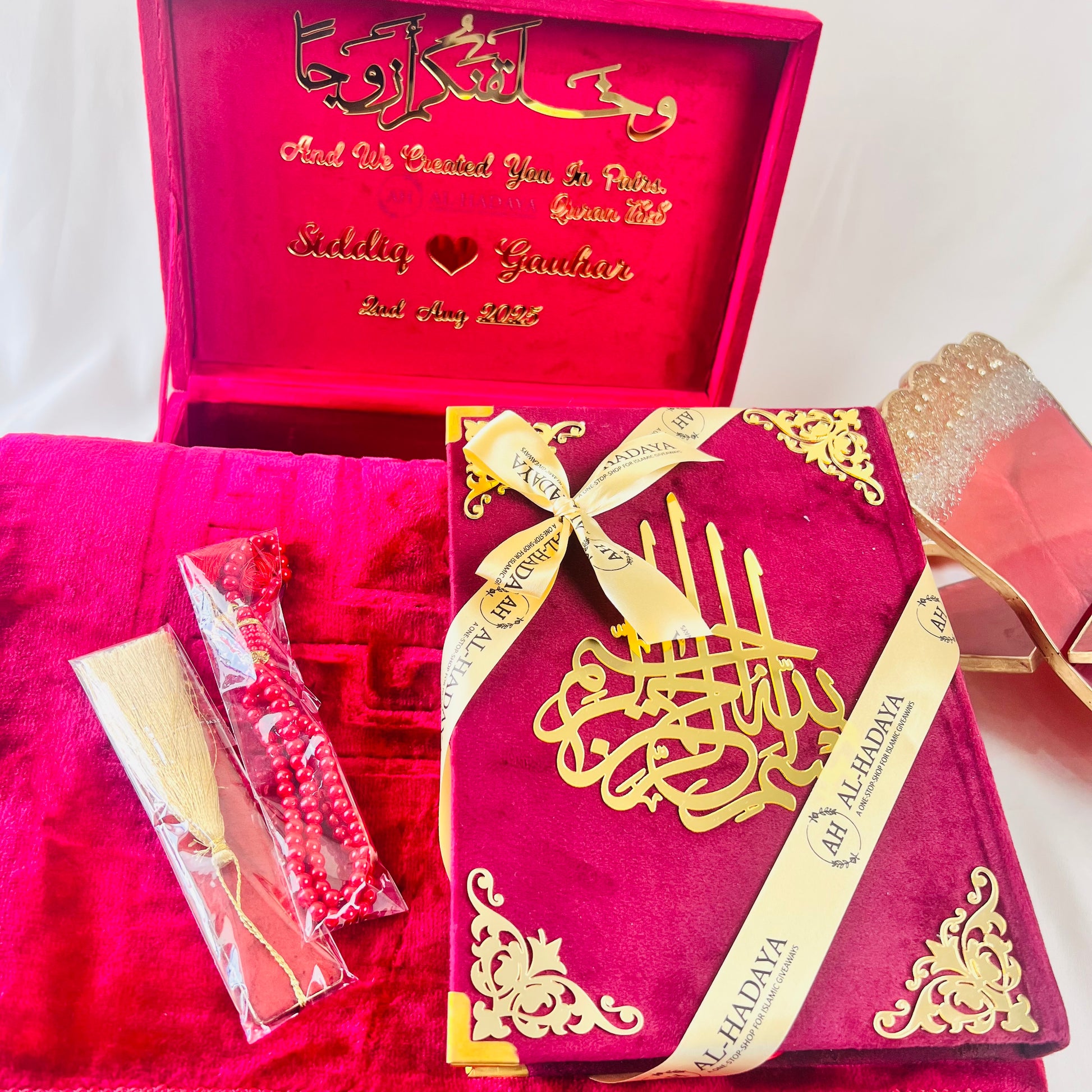 - Personalization of Quran Hamper: To make this gift even more special, we offer the option to personalize it with the names of the bride, groom, or recipient. This thoughtful touch adds a personal connection to the gift, making it truly unique.