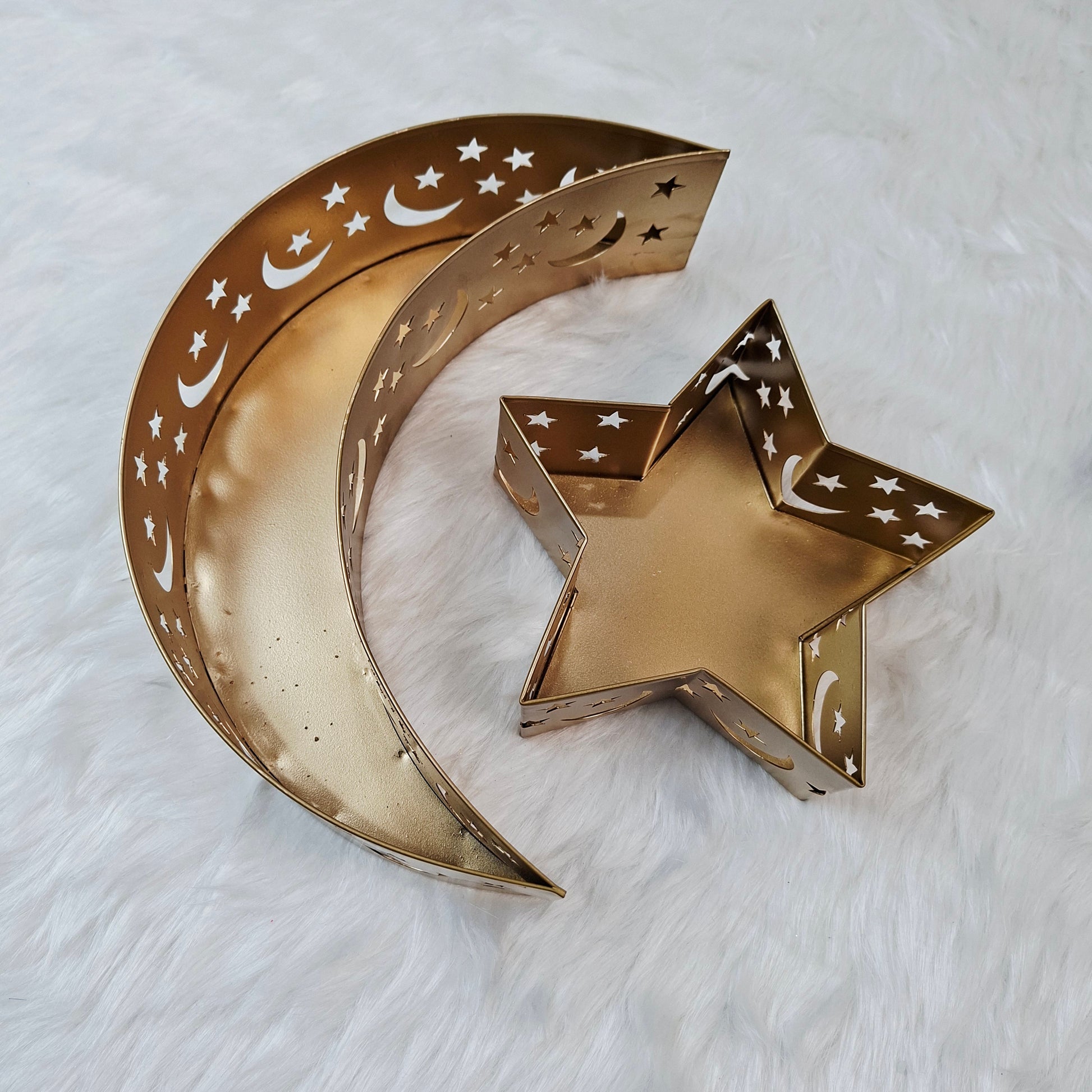 Celebrate the spirit of Ramadan and Eid with this beautifully crafted Crescent Moon & Star Metal Serving Set. Designed in a timeless gold finish with delicate cut-out moon and star details, this set transforms any table into a festive statement.