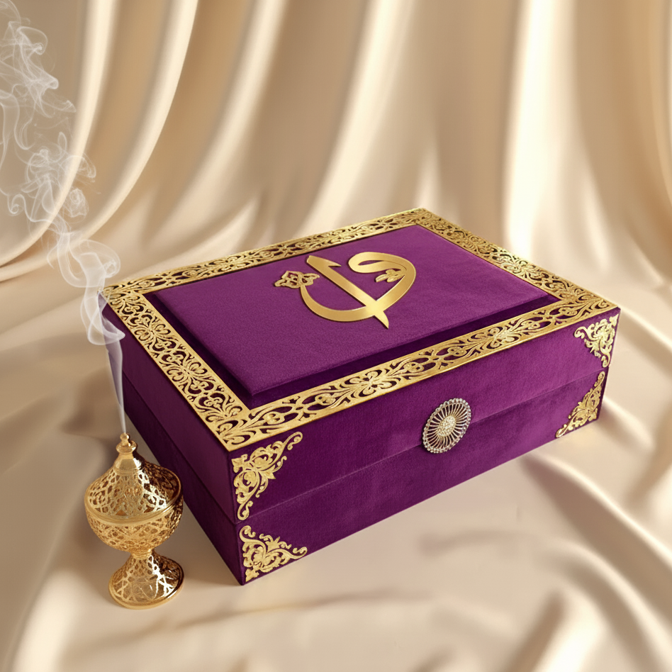 Celebrate faith and elegance with the Al-Hadaya Hand Made Customisable Velvet Covered Quran Box, available in two rich shades — pearl white and deep royal blue. This exquisite piece features a velvet finish adorned with intricate golden Islamic motifs, blending timeless tradition with modern luxury.