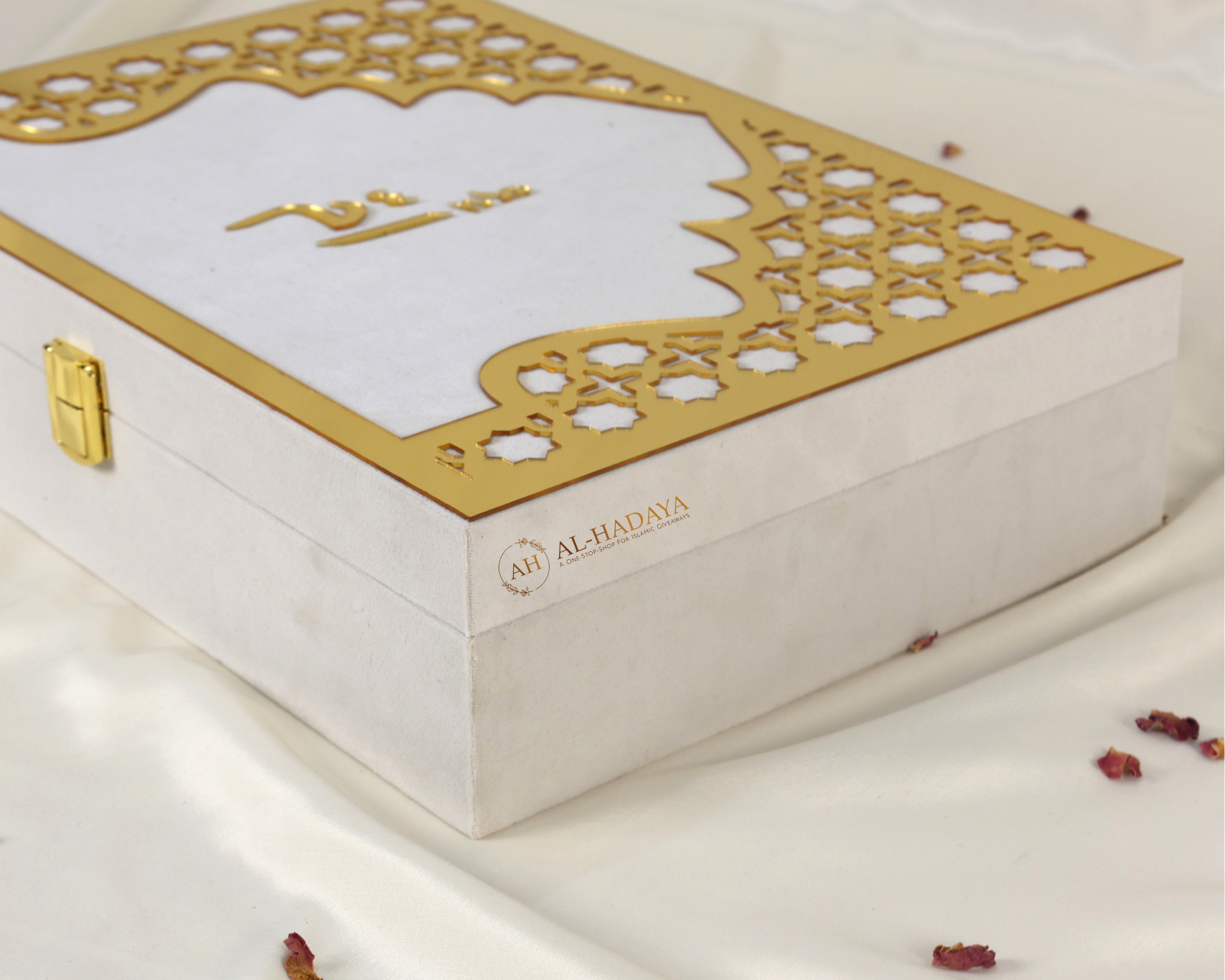Celebrate faith and elegance with the Al-Hadaya Hand Made Customisable Velvet Covered Quran Box, available in two rich shades — pearl white and deep royal blue. This exquisite piece features a velvet finish adorned with intricate golden Islamic motifs, blending timeless tradition with modern luxury.